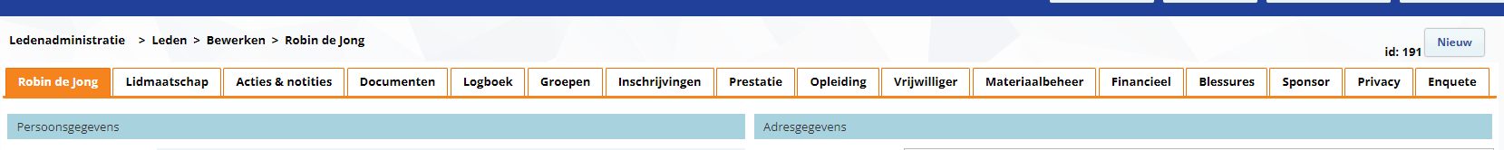 Op de ledenkaart kan je alles terugvinden met betrekking tot het lid. De gegevens zijn opgesplitst tot tabbladen.